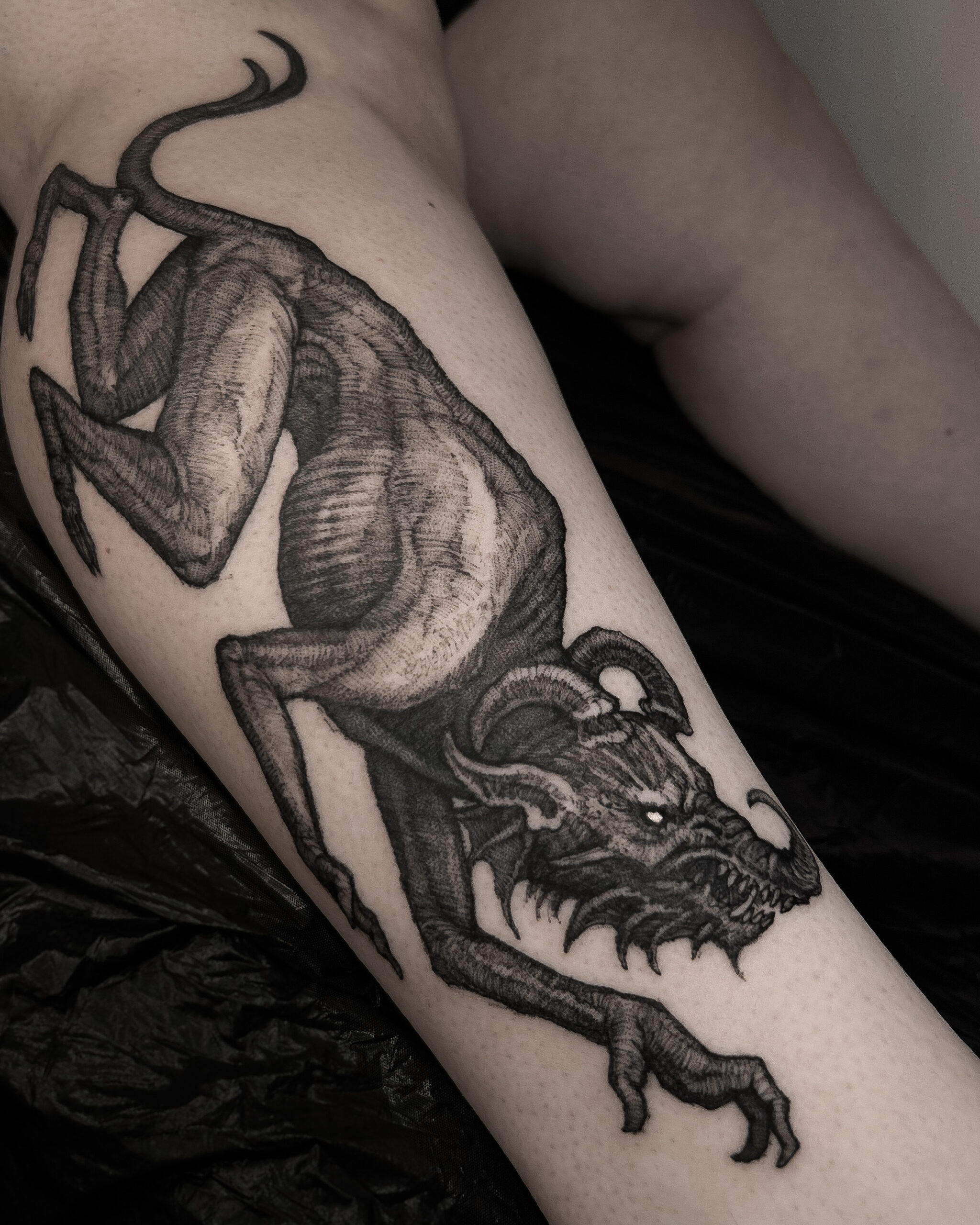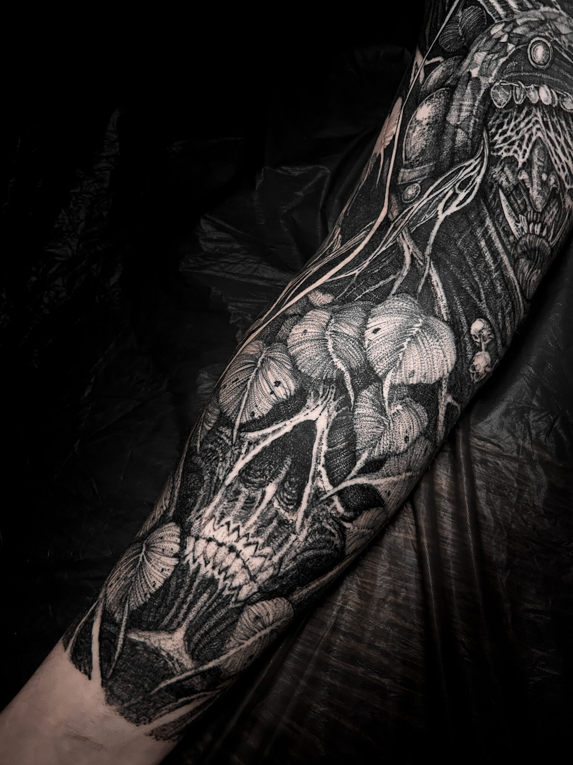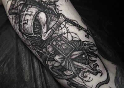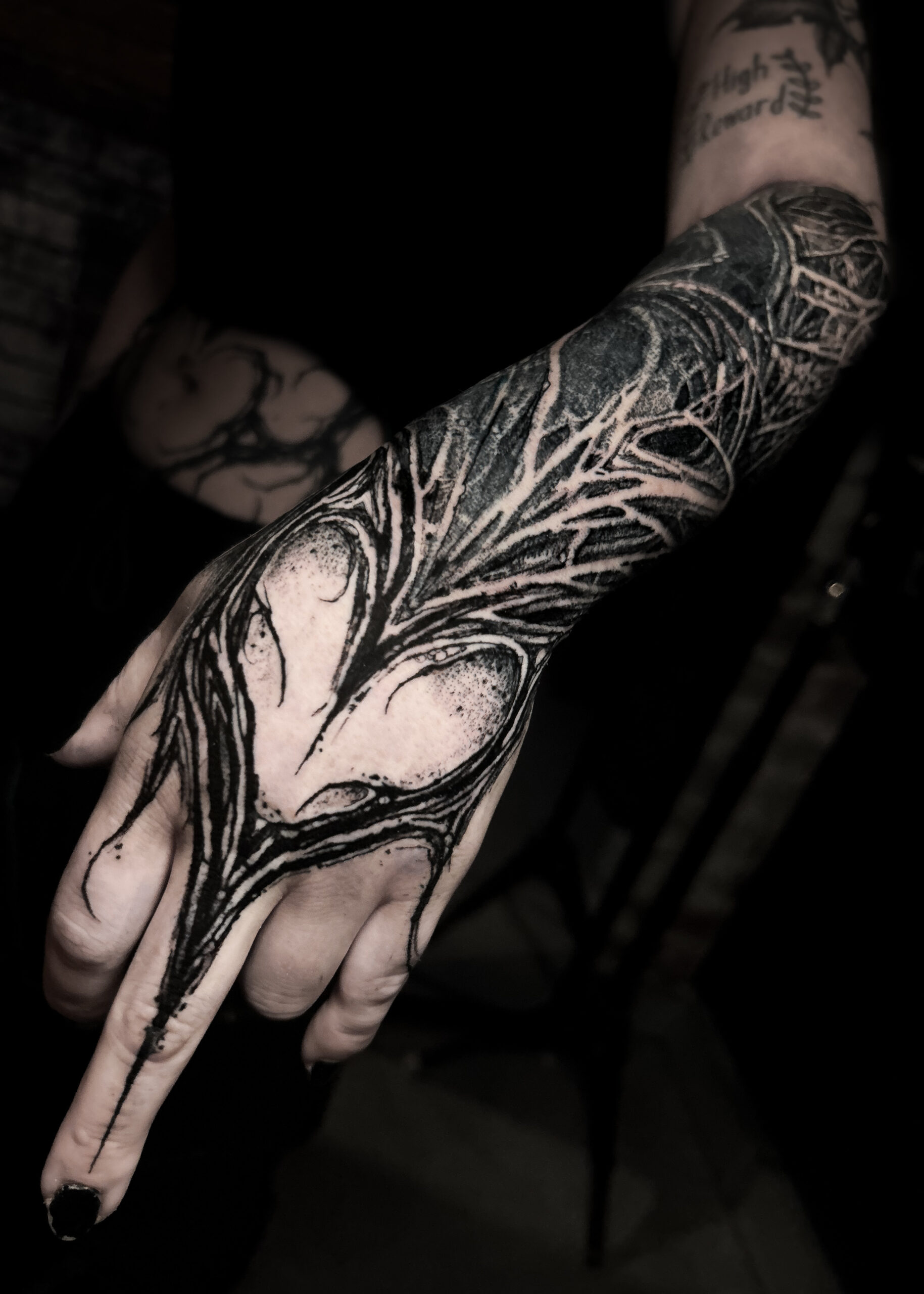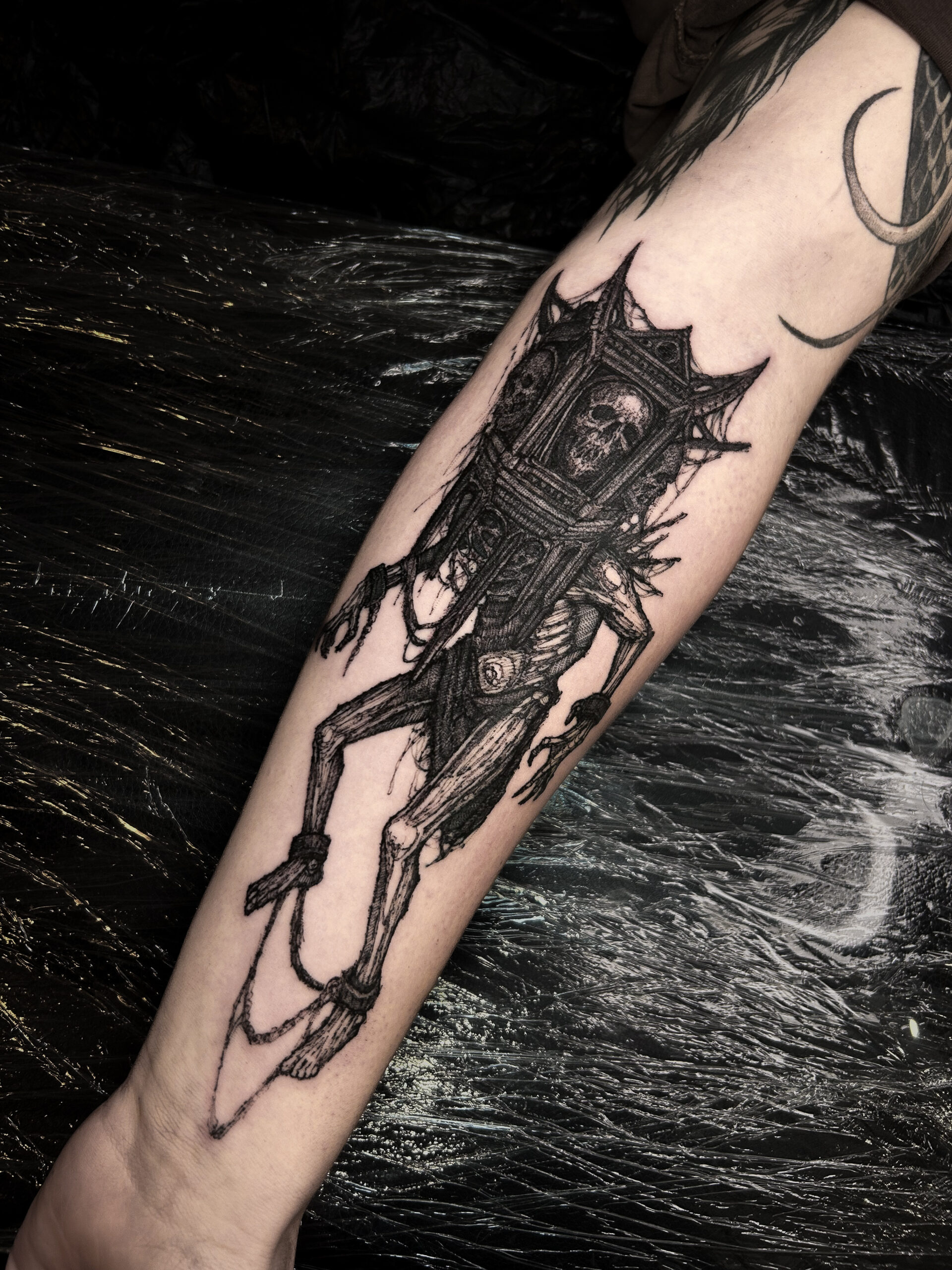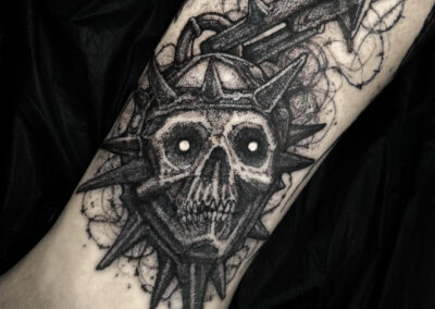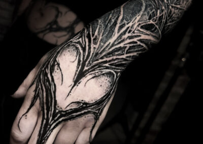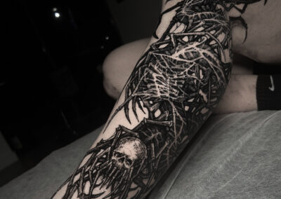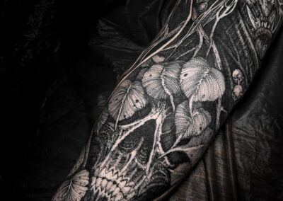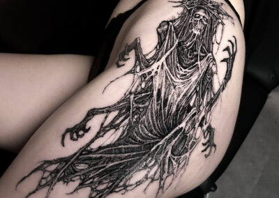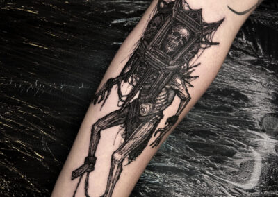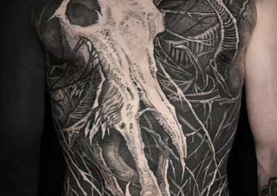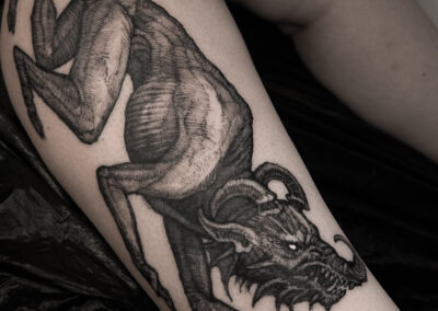 Wolfgang is a dark work tattoo artist known for transforming raw ideas into striking, freehanded designs. Every piece begins with a hand-drawn sketch, where Wolfgang explores form, flow, and symbolism on paper. Once the concept is refined, he takes it directly to the skin — freehanding the final layout using sharpies, letting the body’s natural shape guide the composition. This intuitive, on-skin drawing process allows the final tattoo to feel alive and uniquely tailored to each client. His work is bold, detailed, and unmistakably dark — grounded in process, and sharpened by instinct.