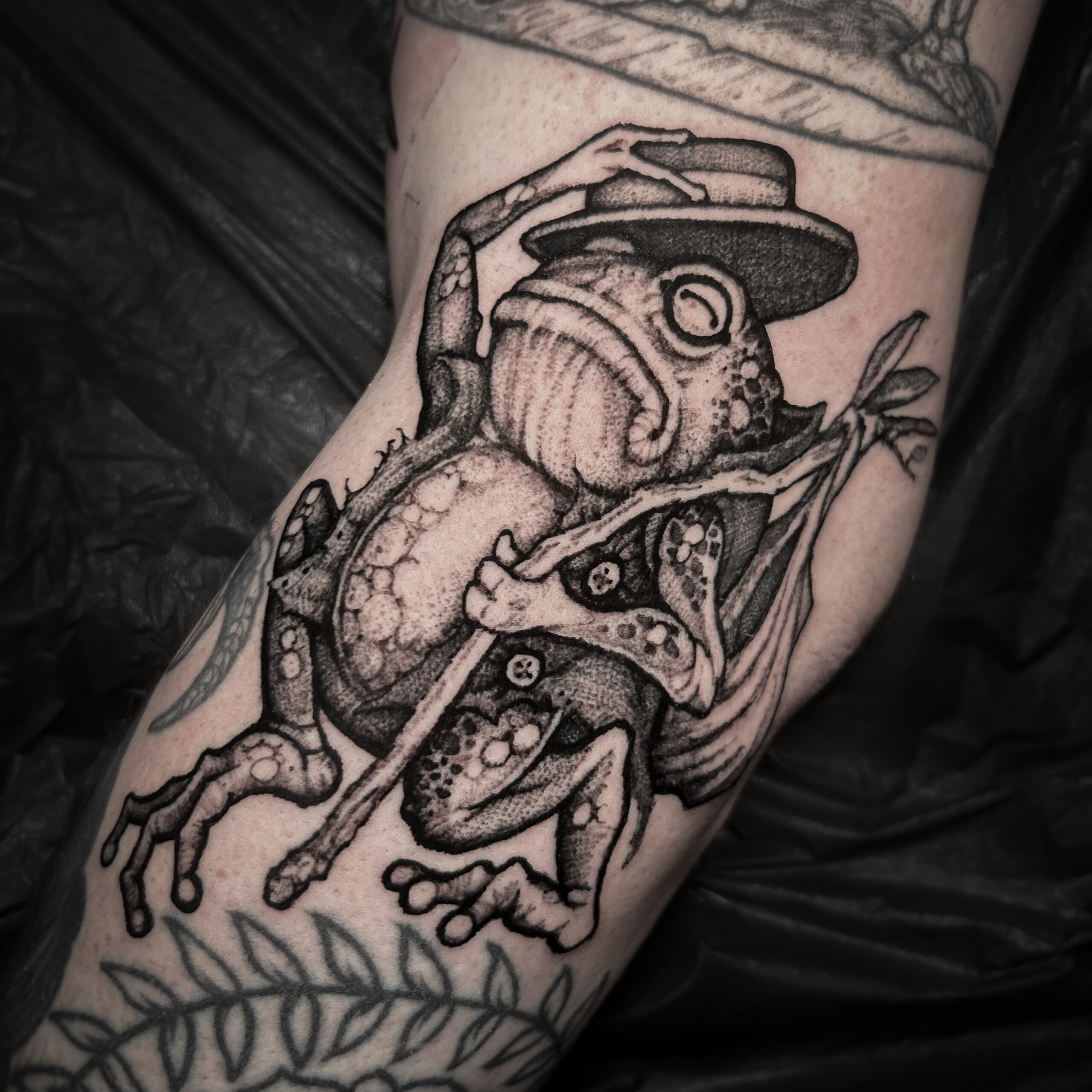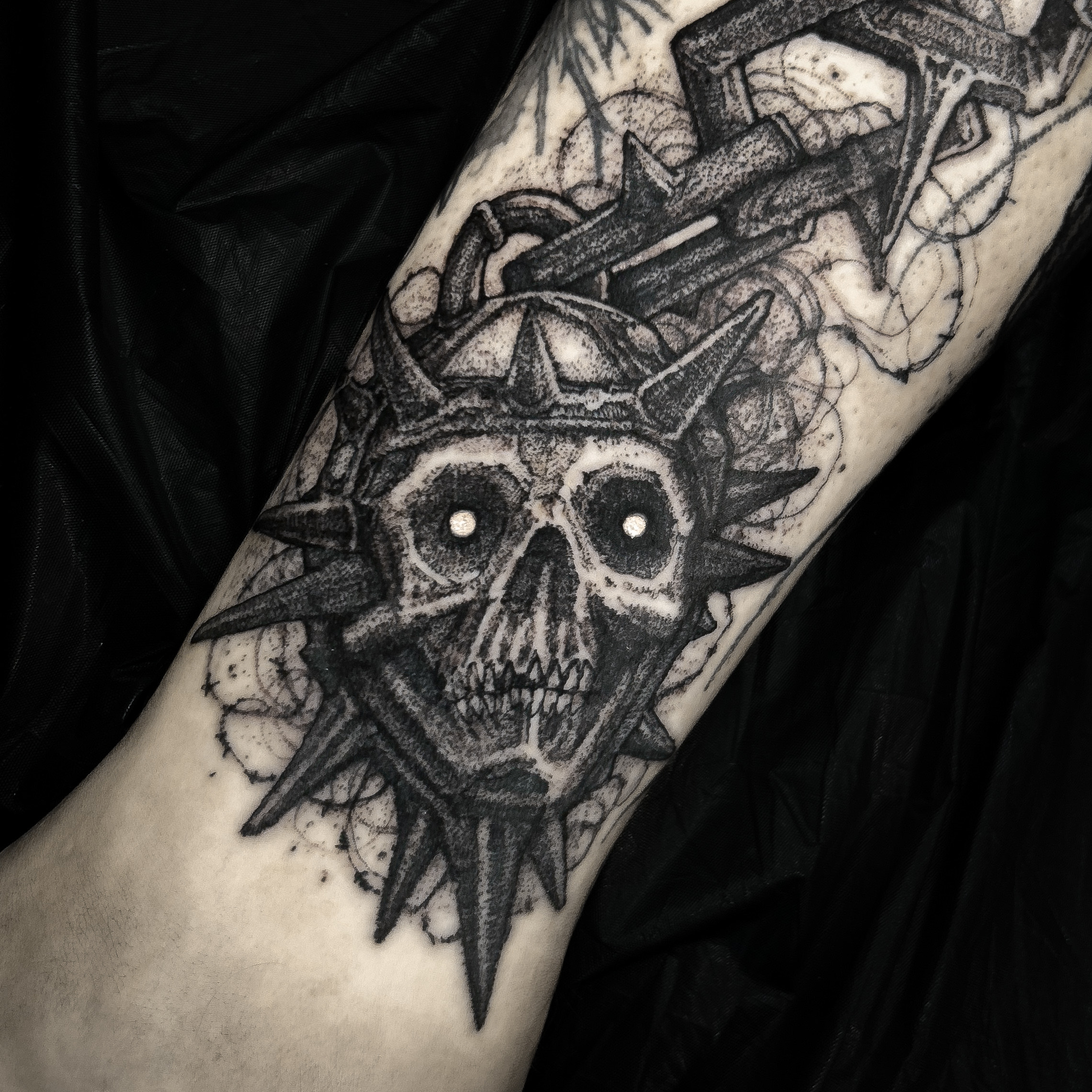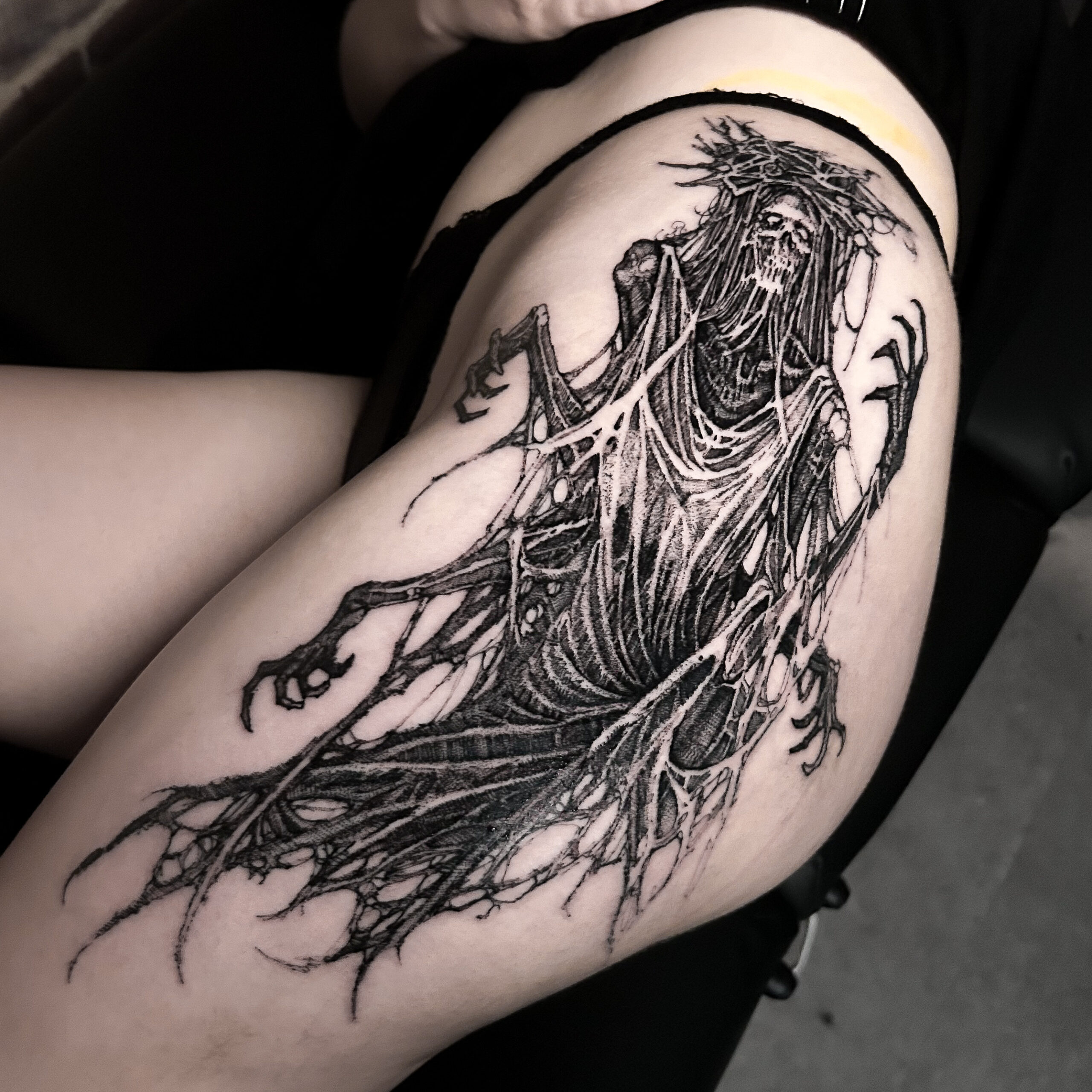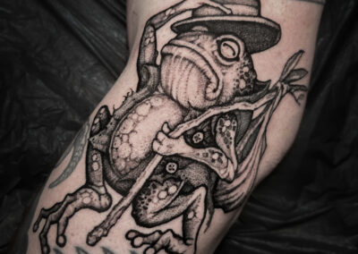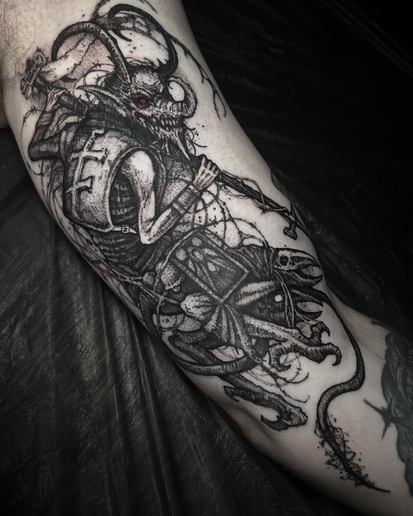 Wolfgang is a dark work tattoo artist known for transforming raw ideas into striking, freehanded designs. Every piece begins with a hand-drawn sketch, where Wolfgang explores form, flow, and symbolism on paper. Once the concept is refined, he takes it directly to the skin — freehanding the final layout using sharpies, letting the body’s natural shape guide the composition. This intuitive, on-skin drawing process allows the final tattoo to feel alive and uniquely tailored to each client. His work is bold, detailed, and unmistakably dark — grounded in process, and sharpened by instinct.